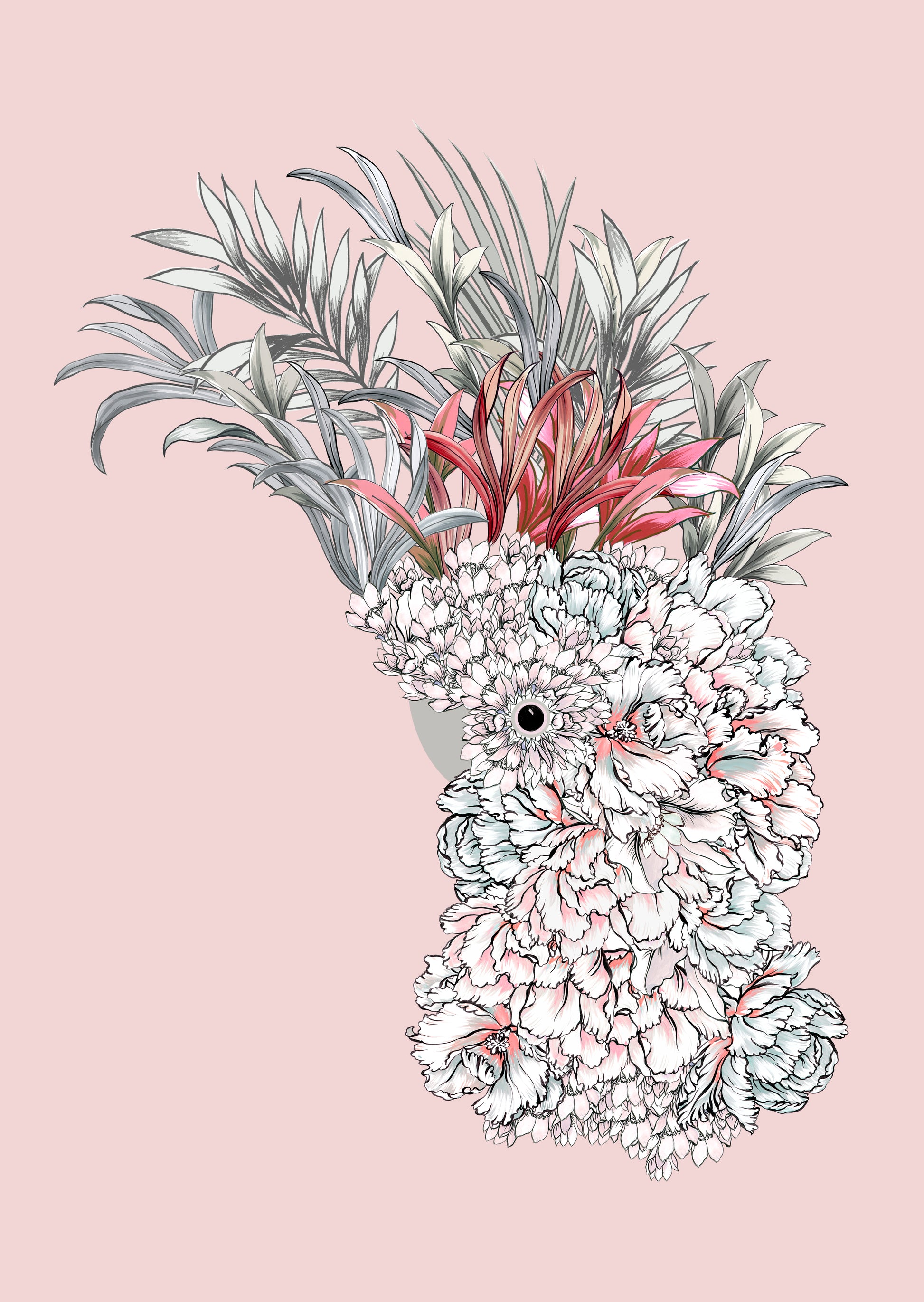 UNFRAMED Printed on responsibly sourced, uncoated A3 sized paper, this handsome Cockatoo is made up of hand illustrated botanical motifs.